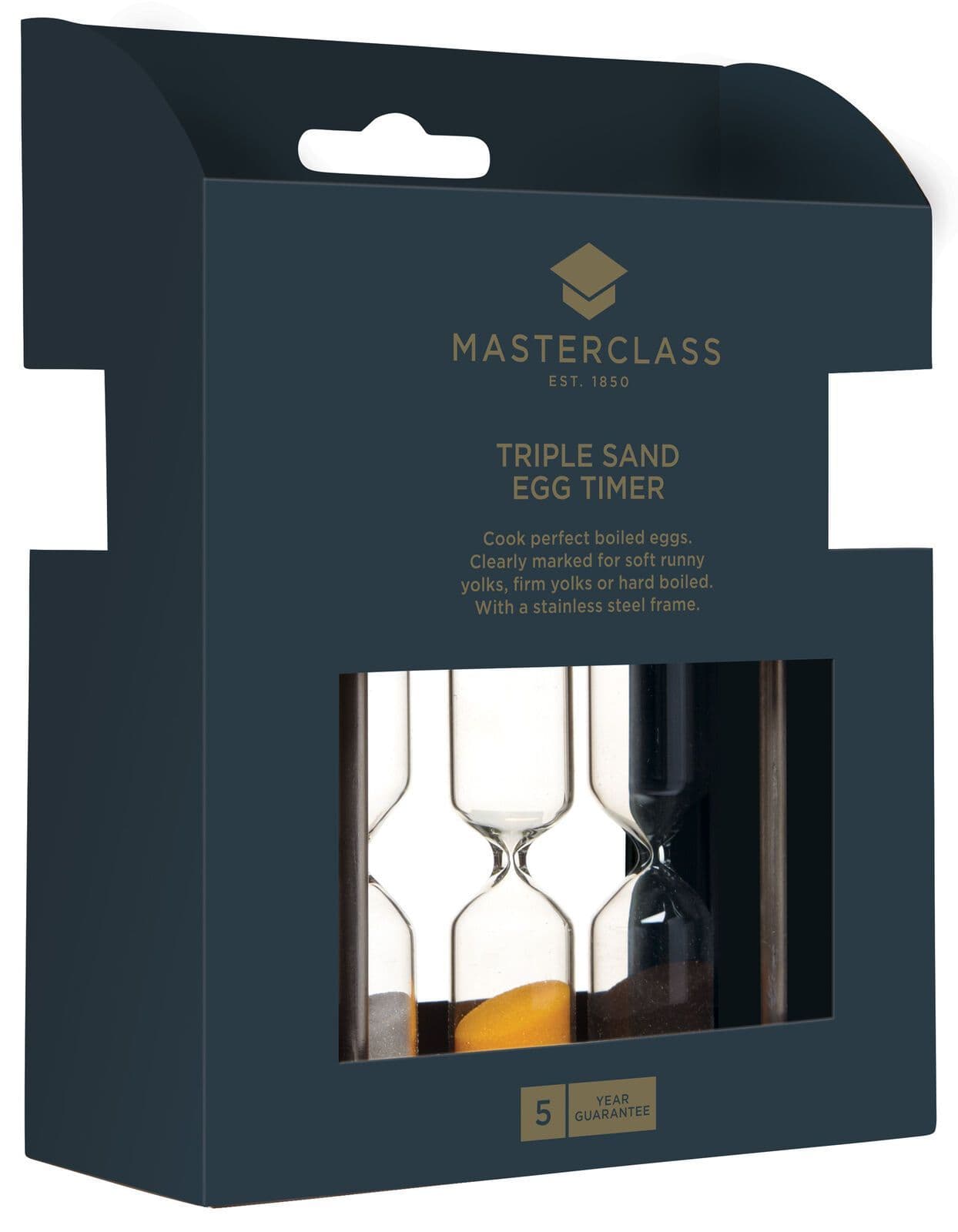Three timers in one! This classically stylish MasterClass egg timer in the hour glass shape features three individual sand timers; three minutes for soft boiled eggs, four minutes for medium boiled eggs, and five minutes for hard boiled egg options. With a satin finish stainless steel frame and felt lined base, this egg timer is a fantastic addition to any kitchen.